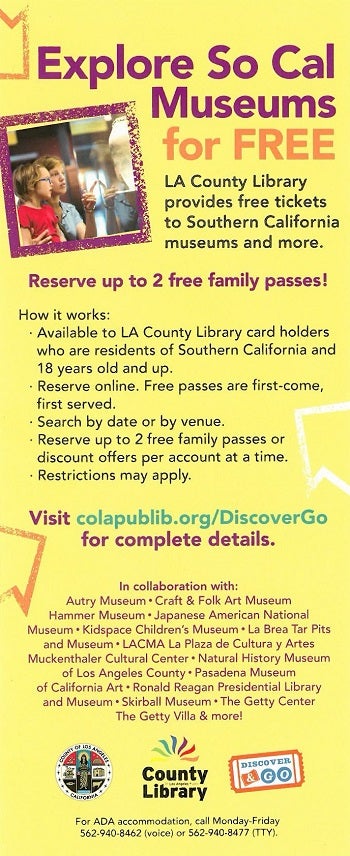 LA County Library provides free tickets to Southern California museums and more. Click here to learn more.